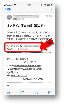 Zoomミーティングルームへ行くためのアドレスがメールで郷の家から届きます。