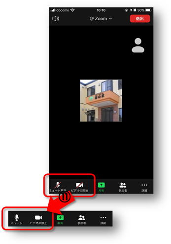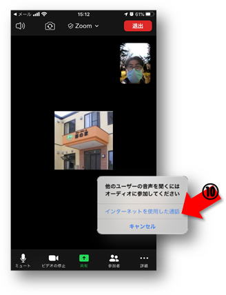 インターネットを使用した通話を選択。ミュート、ビデオの表示が赤色もしくは赤斜線になっている場合は声も画像も届きませんので解除しましょう。