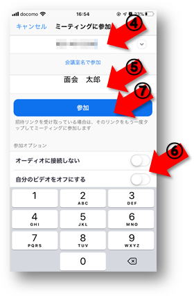 メールで送られてきたミーティングIDを入力し、続いて面会者のお名前を入力し「参加」を押してください。この時「オーディオに接続しない」「自分のビデオをオフする」をオフのままにしてください。